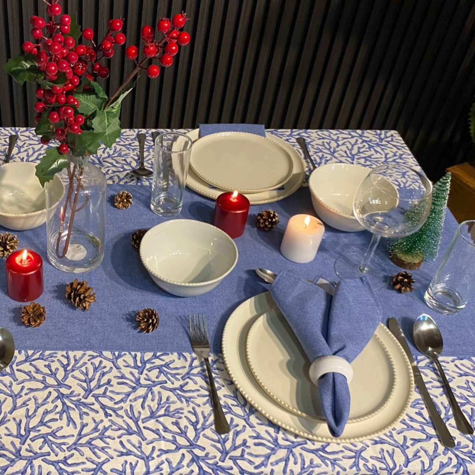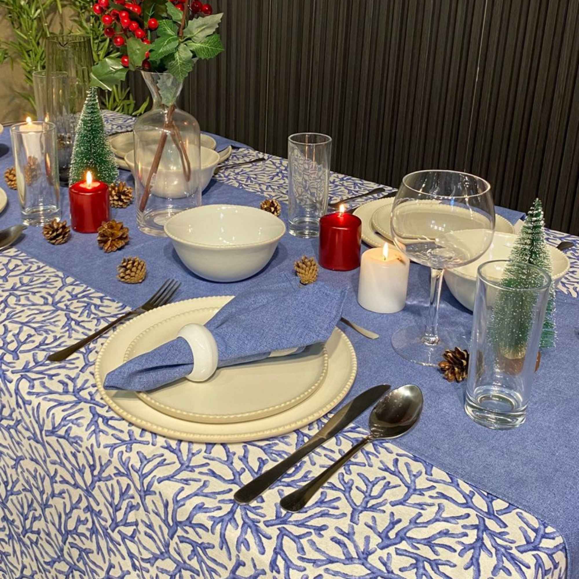 El Mantel Corallium aporta un aire fresco y elegante a tu mesa con su diseño inspirado en corales marinos. Su fondo natural con bordados en azul intenso combina la calidez del algodón con la practicidad del poliéster, logrando una textura suave y fácil de mantener. Ideal para dar un toque costero y sofisticado a tus comidas o celebraciones.